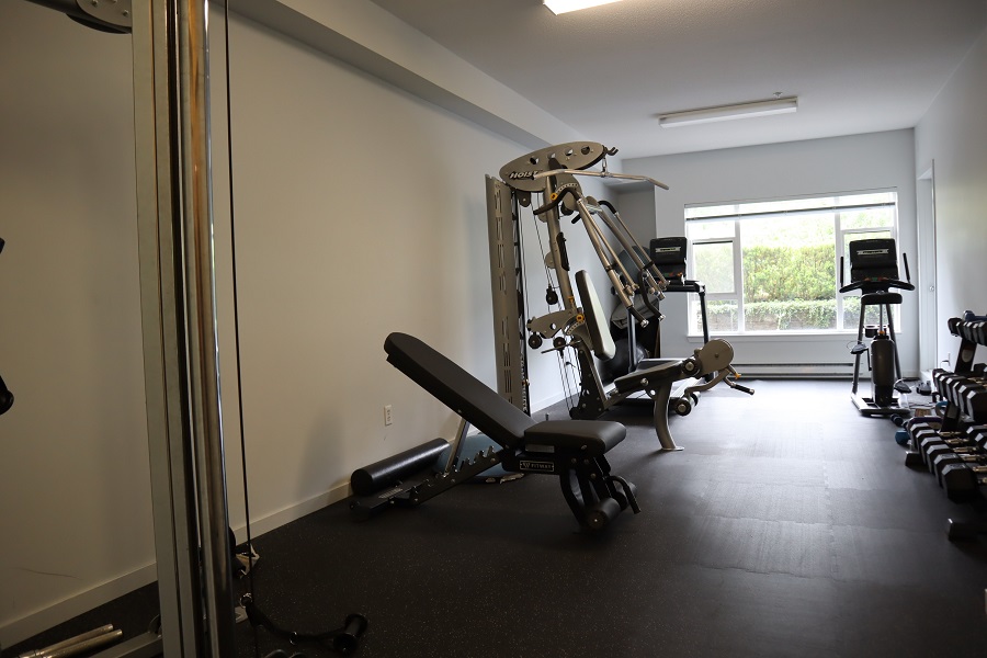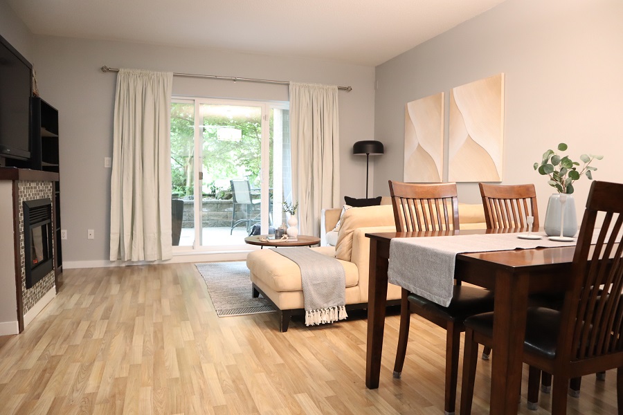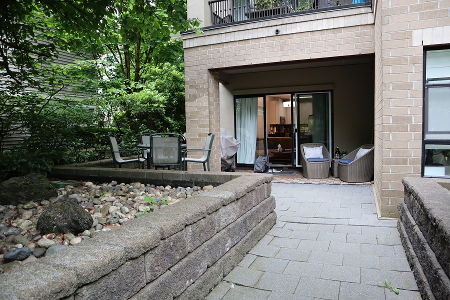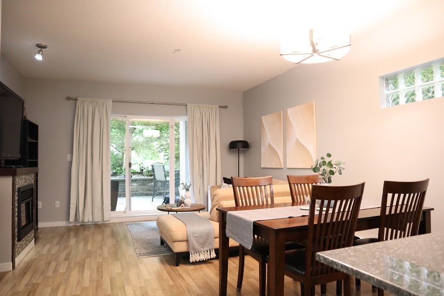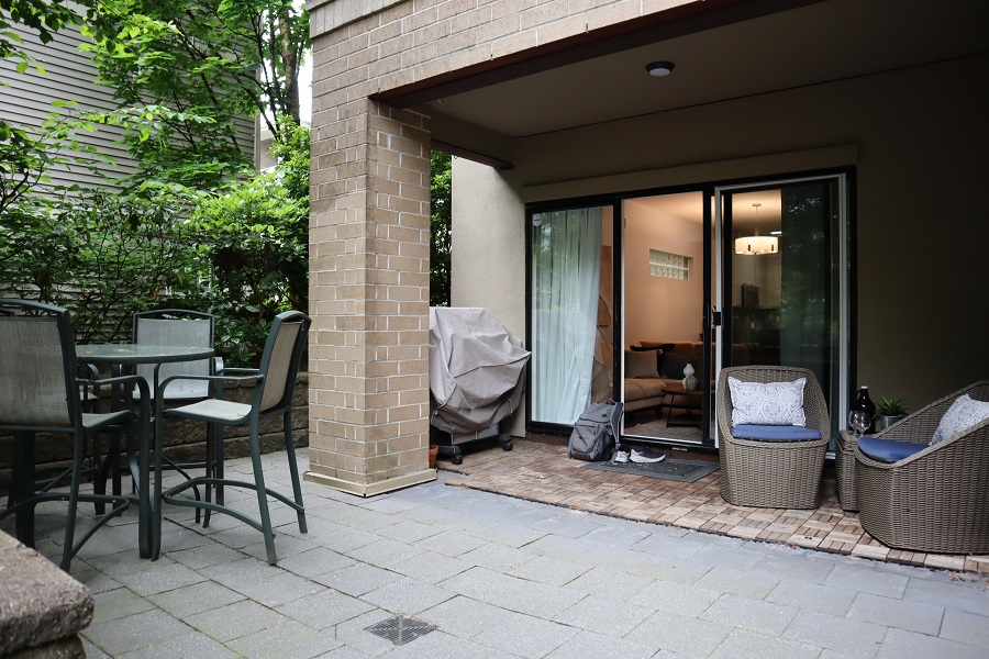 This is Harmony in Port Coquitlam. Located beside Gates Park, this spacious two bedroom with large ground level, concrete patio (322 sqft) is in great condition. Nine foot ceilings throughout. Living room with electric fireplace and engineered wood plank flooring. This is a corner unit and with no one below and only partial living room wall connected to a neighbour. Kitchen has s/s appliances, French door fridge with interior ice maker. Over the range microwave and tiles in the kitchen. Master bedroom has walk in closet and ensuite with bathtub. Main bath is three piece. Building has fitness room, guest suite and a meeting room.